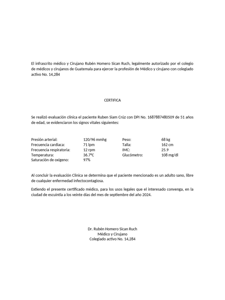 El infrascrito médico y Cirujano Rubén Homero Sican Ruch, legalmente autorizado por el colegio