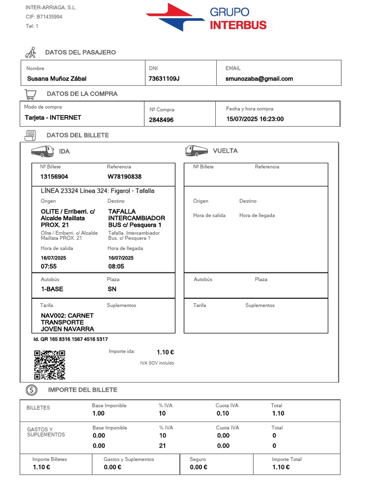 BILLETES Base Imponible % IVA Cuota IVA Total