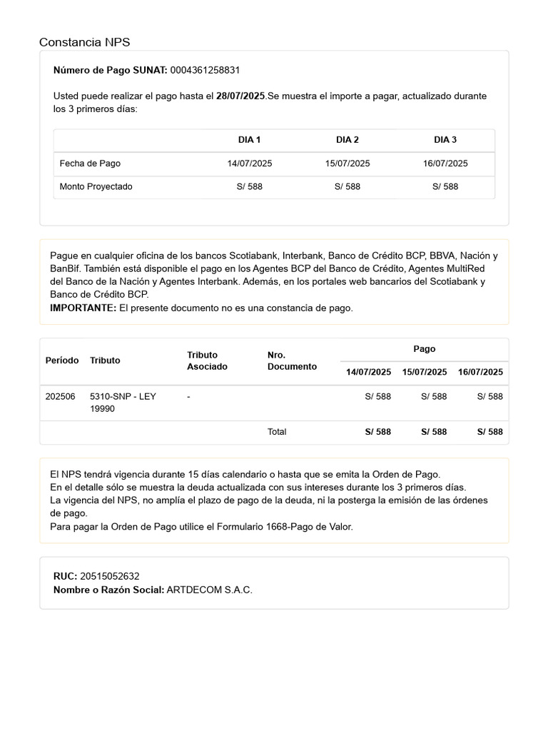 Número de Pago SUNAT: 0004361258831