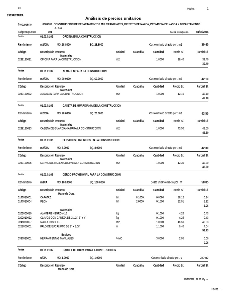Subpresupuesto 001 Fecha presupuesto 04/01/2016