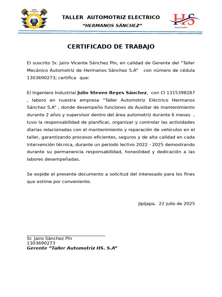 El suscrito Sr. Jairo Vicente Sánchez Pin, en calidad de Gerente del “Taller