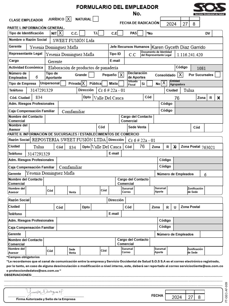 por lo tanto, en caso de alguna desvinculación o modificación a nivel interno, este, deberá ser reportado al correo serviciocliente@sos.com.co