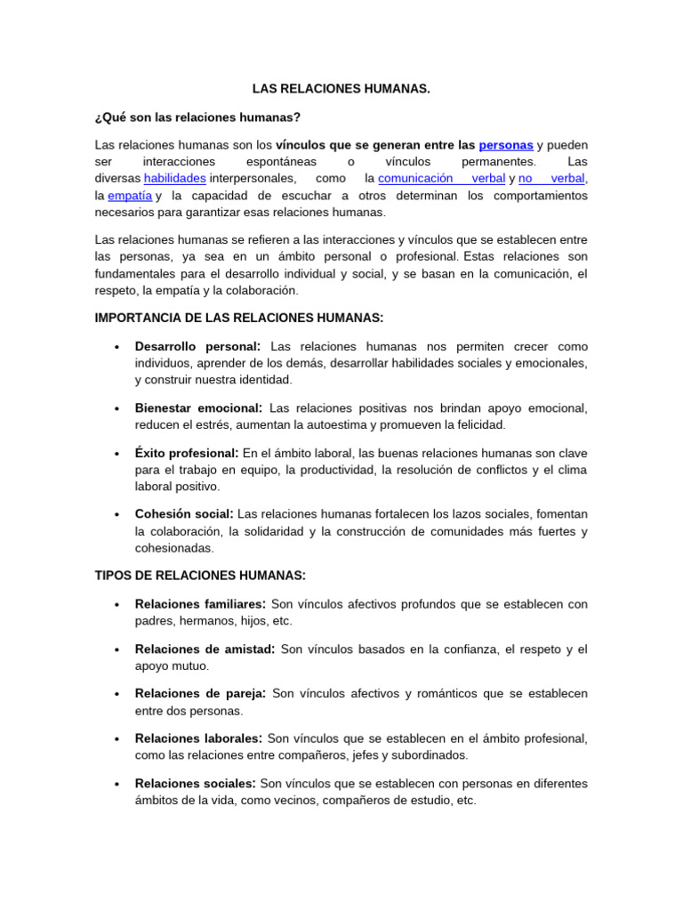 Las relaciones humanas son los vínculos que se generan entre las personas y pueden