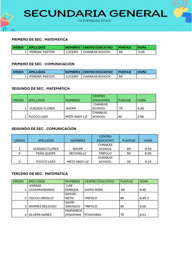 ORDEN APELLIDOS NOMBRES CENTRO EDUCATIVO PUNTAJE HORA