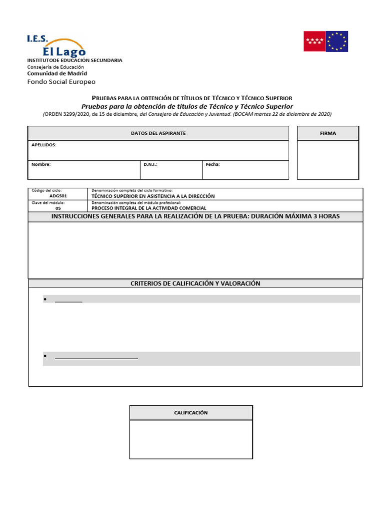 PRUEBAS PARA LA OBTENCIÓN DE TÍTULOS DE TÉCNICO Y TÉCNICO SUPERIOR