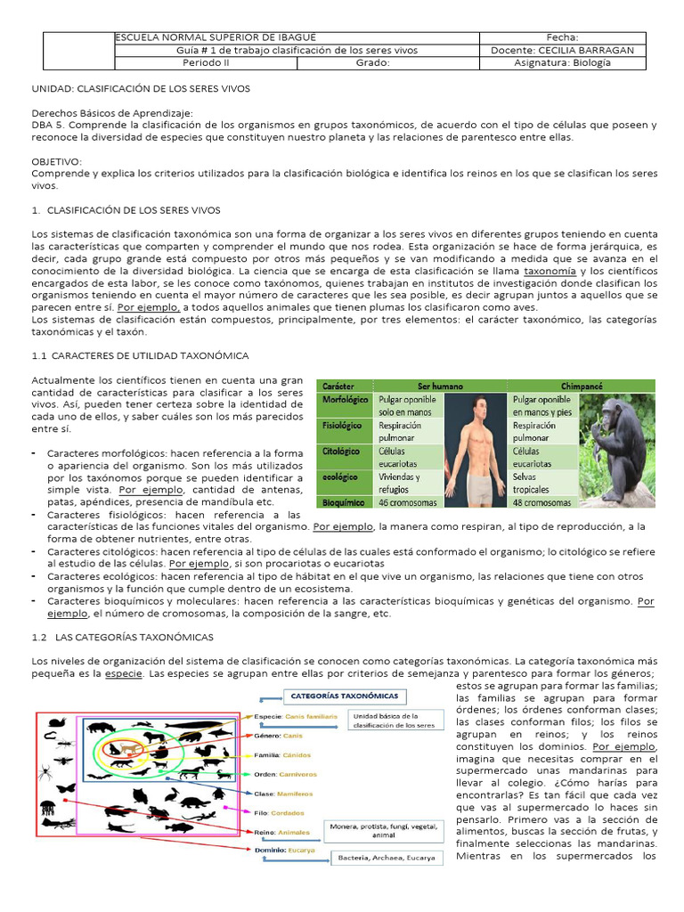 Guía # 1 de trabajo clasificación de los seres vivos Docente: CECILIA BARRAGAN