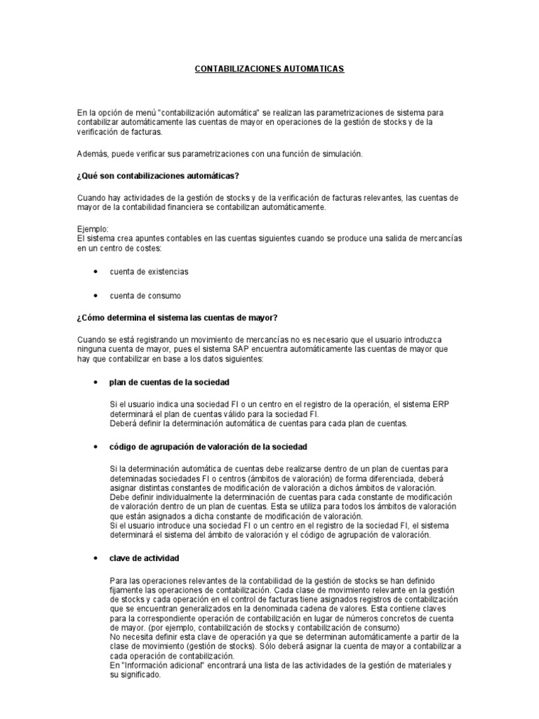En la opcin de men "contabilizacin automtica" se realizan las parametrizaciones de sistema para contabilizar automticamente las cuentas de mayor en operaciones de la gestin de stocks y de la verificacin de facturas. Adems, puede verificar sus parametrizaciones con una funcin de simulacin. Qu son contabilizaciones automticas? Cuando hay actividades de la gestin de stocks y de la verificacin de facturas relevantes, las cuentas de mayor de la contabilidad financiera se contabilizan automticamente. Ejemplo: El sistema crea apuntes contables en las cuentas siguientes cuando se produce una salida de mercancas en un centro de costes: