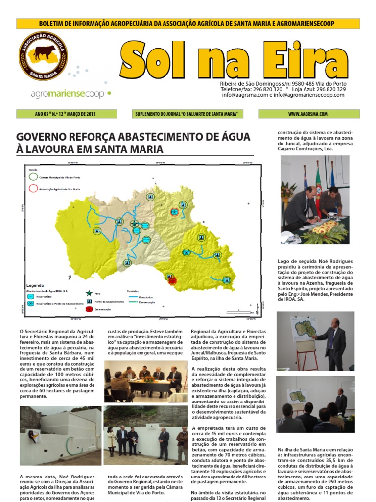 Considerando que o sector agrcola continua a ser um dos principais pilares da economia aoriana, e uma importante atividade econmica e social da ilha de Santa Maria em particular, o Governo Regional dos Aores, atravs da Secretaria Regional da Agricultura e Florestas, tem executado e apoiado um conjunto de importantes iniciativas de investimento para a melhoria da atividade agrcola, com o objetivo de reforar os nveis de competitividade pelo aumento da produtividade e sustentabilidade das exploraes agrcolas. Neste sentido e com inequvoco valor estratgico, a Secretaria Regional da Agricultura e Florestas, pela IROA, S.A., tem apostado fortemente na infraestruturao agrcola ao nvel do estudo, conceo e execuo de redes e sistemas de captao, armazenagem e abastecimento de gua agropecuria, no s para irrigao mas tambm para abeberamento do gado e higienizao das exploraes agrcolas. Em Santa Maria, alis, o investimento do Governo Regional no recurso gua tem sido uma realidade. S no sistema que foi entregue para gesto Camara Municipal de Vila do Porto, que consta de 36 km de condutas, 6 reservatrios, 10 postos de distribuio, 399 ramais individuais explorao e um furo de captao de gua subterrnea, foram investidos mais de 5 milhes de euros. Para o investimento que continua a ser realizado num recurso essencial como a gua, e que continua a ser reclamado pela Associao Agrcola de Santa Maria, com o objetivo de criar uma reserva estratgica que salvaguarde os interesses dos agricultores, no passado dia 23 de Fevereiro foi assinado entre a IROA, S.A. e aquela Associao Agrcola, para benefcio dos agricultores, um protocolo para a gesto de dois sistemas abastecimento de gua lavoura. Um destes sistemas o do reservatrio para abastecimento de gua de 100m3 e posto de abastecimento no Poo Grande, freguesia de Santa Brbara, executado em 2010, com um investimento total de 47.650,00 e que possibilita o abastecimento de gua nesta freguesia e nas freguesias circundantes, uma vez que a nascente muito produtiva. Mas tem o Governo Regional a conscincia de que, para a prossecuo do objetivo de melhoria contnua das condies de trabalho dos agricultores marienses, necessrio continuar a dirigir investimento para aumentar e melhorar a