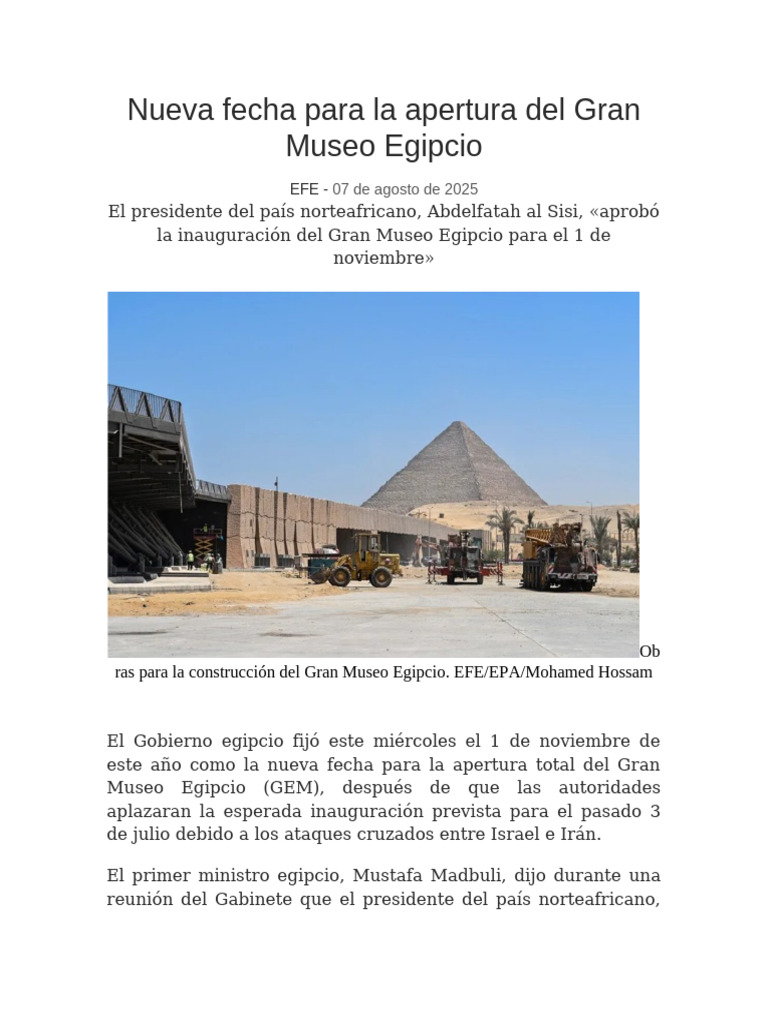 la inauguración del Gran Museo Egipcio para el 1 de