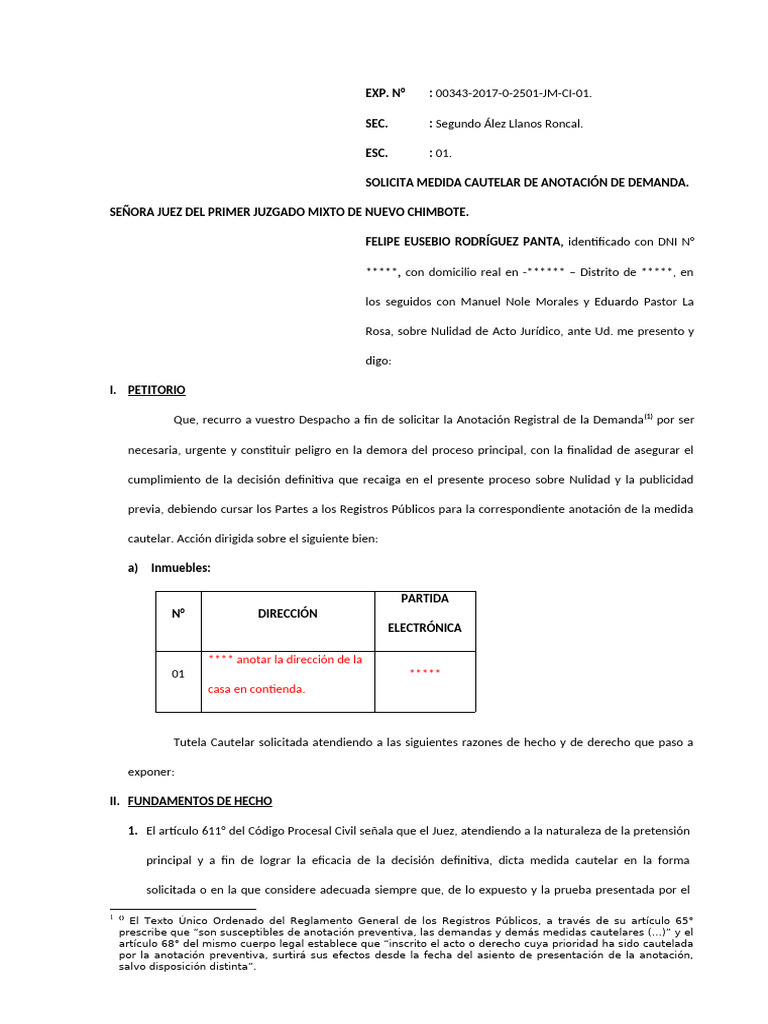 Que, recurro a vuestro Despacho a fin de solicitar la Anotación Registral de la Demanda (1) por ser