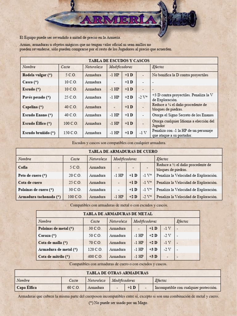 Peto de cuero (*) 20 C.O. Armadura -1 HP +1 D -1 V* Penaliza la Velocidad de Exploración.