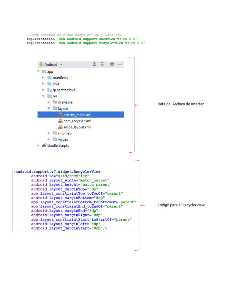 Después en ellos archivos de interfaz agregaremos el código para utilizar el RecyclerView