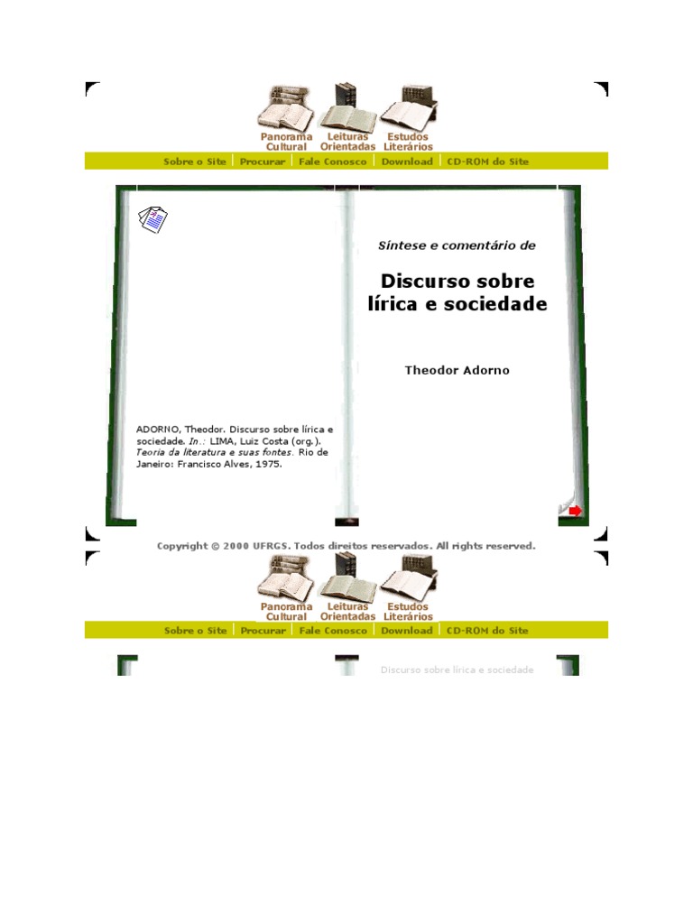 Discurso sobre lrica e sociedade no se satisfazem com sentimentos vagos e abrangentes sobre o universal. Seu "pensar" interroga concretamente pelo contedo social. Ou seja: o "pensamento determinador no uma reflexo alheia e externa arte: exigida por toda composio de linguagem". Os conceitos presentes num poema no se apresentam de forma intuda, simplesmente; para poderem ser esteticamente intudos, eles tambm so pensados; o pensar posto em jogo, pelo poema, transcendendo-o. O autor alerta que a interpretao social da lrica, como tambm de todas as obras de arte, no deve ter em vista a situao social ou a insero social das obras, ou de seus autores, sem uma mediao. Tem de procurar estabelecer como o "todo" de uma sociedade, enquanto unidade em si contraditria, aparece na obra; em qu a obra a obedece e -7-