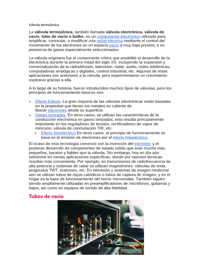 La válvula termoiónica, también llamada válvula electrónica, válvula de