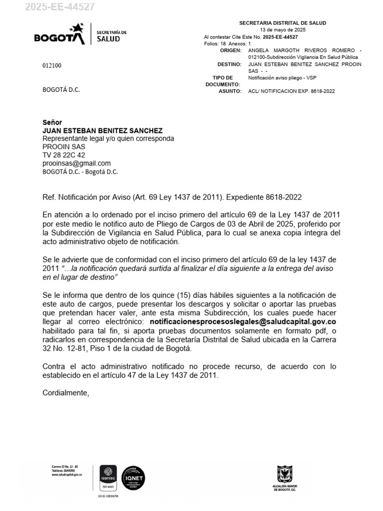 PROOINSAS, ubicado en la TV 28 22C 42, de esta ciudad, con la misma dirección