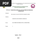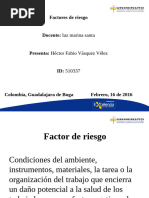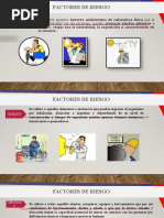 FACTORES DE RIESGOS FISIOLGICOS O ERGONMICOS Involucra todos aquellos agentes o situaciones que tienen que ver con la adecuacin del trabajo, o los elementos de trabajo a la fisonoma humana. Representan factor de riesgo los objetos, puestos de trabajo, mquinas, equipos y herramientas cuyo peso, tamao, forma y diseo pueden provocar sobre-esfuerzo, as como posturas y movimientos inadecuados que traen como consecuencia fatiga fsica y lesiones osteomusculares. FACTORES DE RIESGO QUMICO Son todos aquellos elementos y sustancias que, al entrar en contacto con el organismo, bien sea por inhalacin, absorcin o ingestin, pueden provocar intoxicacin, quemaduras o lesiones sistmicas, segn el nivel de concentracin y el tiempo de exposicin. FACTORES DE RIESGO FSICO Se refiere a todos aquellos factores ambientales que dependen de las propiedades fsicas de los cuerpos, tales como carga fsica, ruido, iluminacin, radiacin ionizante, radiacin no ionizante, temperatura elevada y vibracin, que actan sobre los tejidos y rganos del cuerpo del trabajador y que pueden producir efectos nocivos, de acuerdo con la intensidad y tiempo de exposicin de los mismos. FACTORES DE RIESGO ARQUITECTNICO Las caractersticas de diseo, construccin, mantenimiento y deterioro de las instalaciones locativas pueden ocasionar lesiones a los trabajadores o incomodidades para desarrollar el trabajo, as como daos a los materiales de la empresa, como: Pisos, escaleras, barandas, plataformas y andamios defectuosos o en mal estado. Muros, puertas y ventanas defectuosas o en mal estado. Techos defectuosos o en mal estado. Superficie del piso deslizante o en mal estado Falta de orden y aseo. Sealizacin y demarcacin deficiente, inexistente o inadecuada.