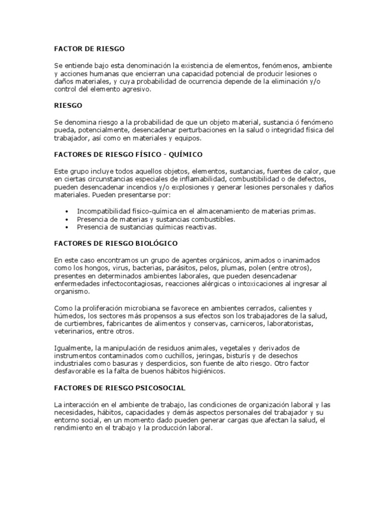 capacidad potencial de producir lesiones o daos materiales, y cuya probabilidad de ocurrencia depende de la eliminacin y/o control del elemento agresivo. RIESGO Se denomina riesgo a la probabilidad de que un objeto material, sustancia fenmeno pueda, potencialmente, desencadenar perturbaciones en la salud o integridad fsica del trabajador, as como en materiales y equipos. FACTORES DE RIESGO FSICO - QUMICO Este grupo incluye todos aquellos objetos, elementos, sustancias, fuentes de calor, que en ciertas circunstancias especiales de inflamabilidad, combustibilidad o de defectos, pueden desencadenar incendios y/o explosiones y generar lesiones personales y daos materiales. Pueden presentarse por: Incompatibilidad fsico-qumica en el almacenamiento de materias primas. Presencia de materias y sustancias combustibles. Presencia de sustancias qumicas reactivas.