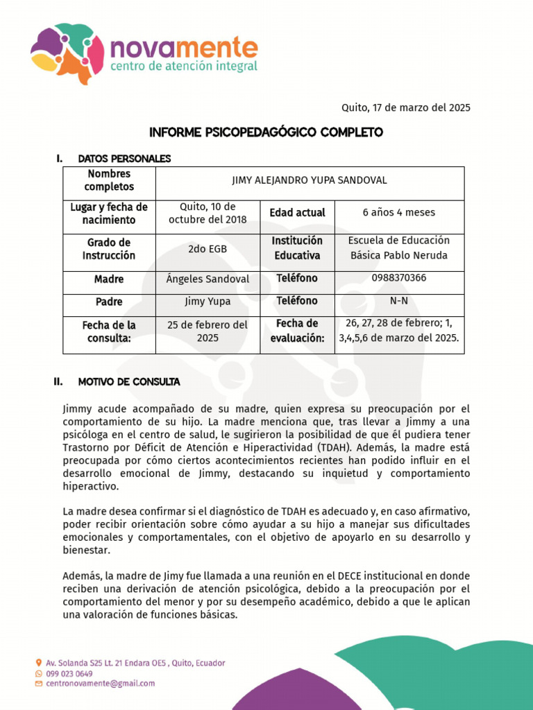 familiares y los resultados obtenidos, debo informar que JIMY ALEJANDRO YUPA