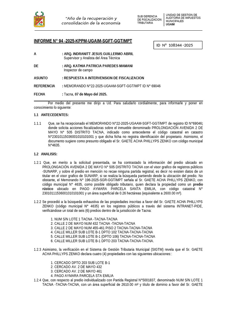 INFORME N° 94 -2025-KPPM-UGAIM-SGFT-GGT/MPT
