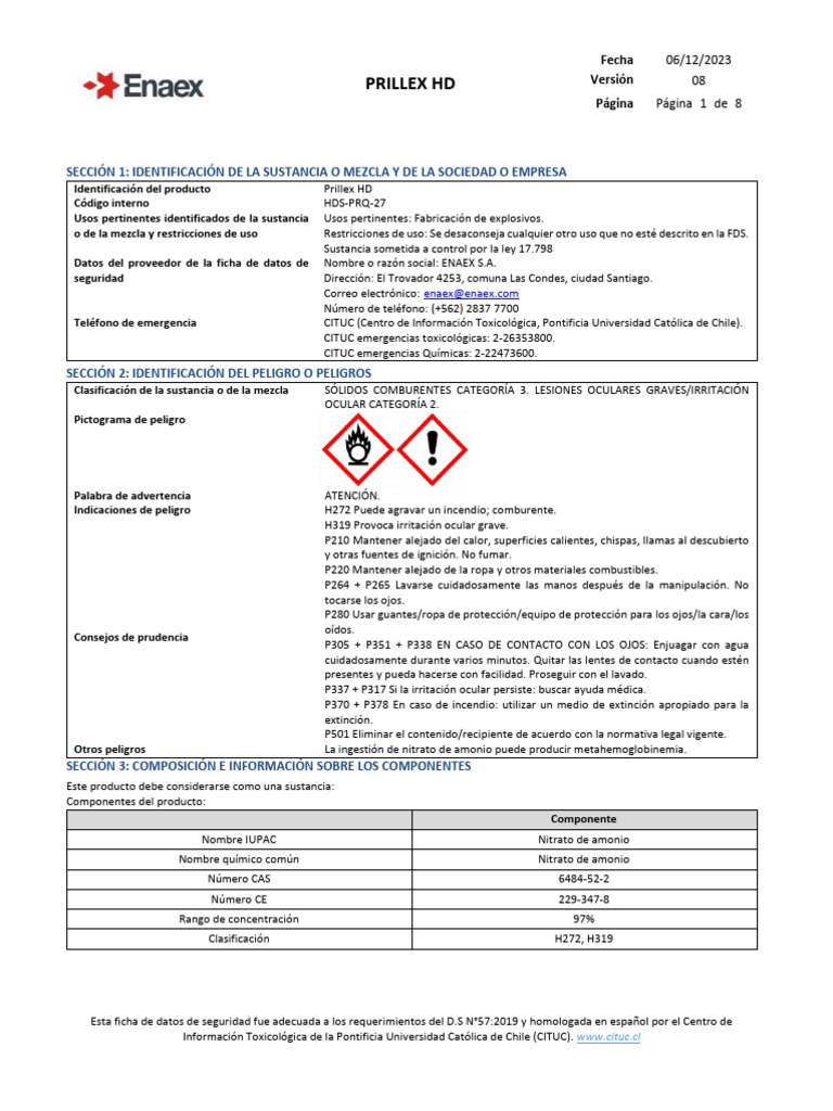 Datos del proveedor de la ficha de datos de Nombre o razón social: ENAEX S.A.