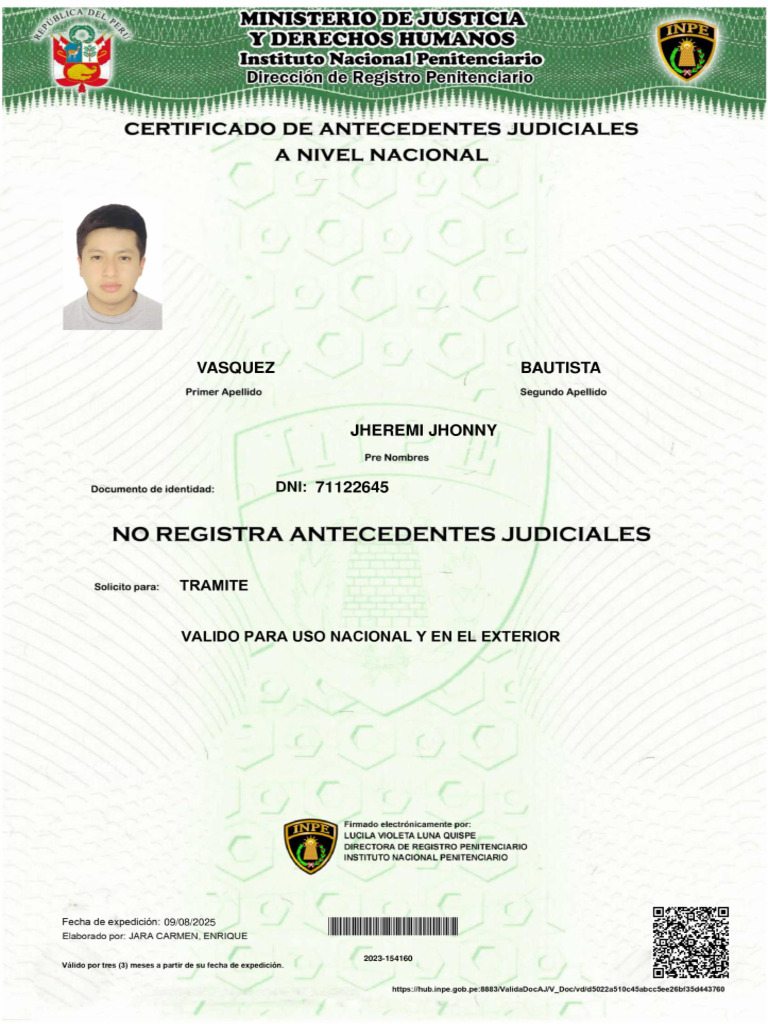 El documento es un certificado de antecedentes judiciales a nivel nacional para Jheremi Jhonny Vasquez Bautista, que indica que no registra antecedentes judiciales. Este certificado es válido para uso nacional y en el exterior, y fue emitido por el Instituto Nacional Penitenciario. La fecha de expedición es el 09/08/2025.
