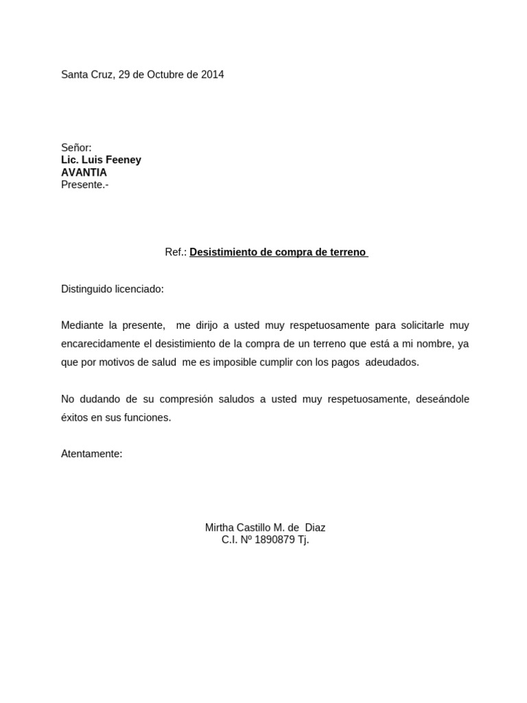 encarecidamente el desistimiento de la compra de un terreno que está a mi nombre, ya