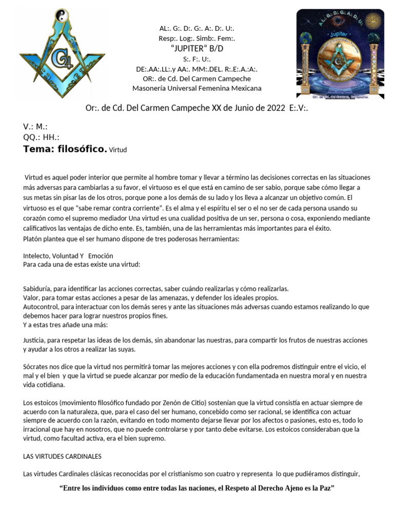 dentro de la sociedad masónica y más aún en la sociedad profana, ya que la VIRTUD, en todas sus acepciones, es lo que