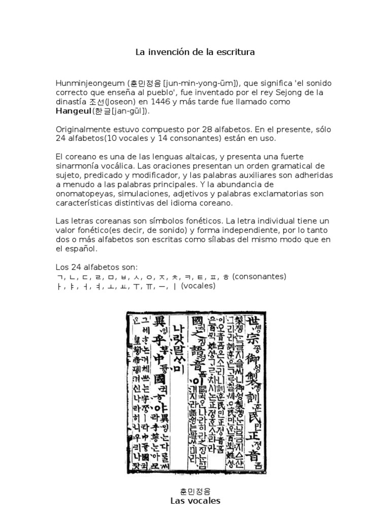 Hunminjeongeum ( [jun-min-yong-m]), que significa 'el sonido correcto que ensea al pueblo', fue inventado por el rey Sejong de la dinasta (Joseon) en 1446 y ms tarde fue llamado como Hangeul([jan-gl]). Originalmente estuvo compuesto por 28 alfabetos. En el presente, slo 24 alfabetos(10 vocales y 14 consonantes) estn en uso. El coreano es una de las lenguas altaicas, y presenta una fuerte sinarmona voclica. Las oraciones presentan un orden gramatical de sujeto, predicado y modificador, y las palabras auxiliares son adheridas a menudo a las palabras principales. Y la abundancia de onomatopeyas, simulaciones, adjetivos y palabras exclamatorias son caractersticas distintivas del idioma coreano. Las letras coreanas son smbolos fonticos. La letra individual tiene un valor fontico(es decir, de sonido) y forma independiente, por lo tanto dos o ms alfabetos son escritas como slabas del mismo modo que en el espaol. Los 24 alfabetos son: , , , , , , , , , , , , , (consonantes) , , , , , , , , , (vocales)