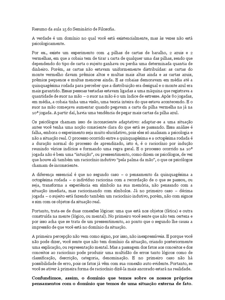 . Por ex., existe um experimento com 4 pilhas de cartas de baralho, 2 azuis e 2 vermelhas, em que a cobaia tem de tirar 1 carta de qualquer uma das pilhas, sendo que dependendo do tipo de carta o sujeito ganhava ou perdia uma determinada quantia de dinheiro. Porm, as cartas no estavam uniformemente distribudas: as cartas do monte vermelho davam prmios altos e multas mais altas ainda e as cartas azuis, prmios pequenos e multas menores ainda. E as cobaias demoravam em mdia at a quinquagsima rodada para perceber que a distribuio era desigual e o monte azul era mais garantido. Essas pessoas testadas estavam ligadas a uma mquina que registrava a quantidade de suor na mo o suor na mo o um ndice de estresse. Aps 80 jogadas, em mdia, a cobaia tinha uma viso, uma teoria inteira do que estava acontecendo. E o suor na mo comeava aumentar quando pegavam a carta da pilha vermelha na j na 10 jogada. A partir da, havia uma tendncia de pegar mais cartas da pilha azul. Os psiclogos chamam isso de inconsciente adaptativo: adaptar-se a uma situao antes voc tenha uma noo consciente clara do que est se passando. Essa anlise falha, embora o experimento seja muito elucidativo, pois eles s analisam a psicologia e no a situao real. O processo ocorrido entre a quinquagsima e a octogsima rodada a durao normal do processo de aprendizado, isto , o raciocnio por induo reunindo vrios indcios e formando uma regra geral. E o processo ocorrido na 10 jogada no bem uma intuio, ou pressentimento, como dizem os psiclogos, de vez que houve ali tambm um raciocnio indutivo pela palma da mo, o que os psiclogos chamam de inconsciente. A diferena essencial que no segundo caso o pensamento da quinquagsima a octogsima rodada o indivduo raciocina com a recordao de o que se passou, ou seja, transforma a experincia em smbolo na sua memria, no pensando com a situao imediata, mas raciocinando com smbolos. J no primeiro caso dcima jogada o sujeito est fazendo tambm um raciocnio indutivo, porm, no com signos e sim com os objetos da situao real. Portanto, trata-se de duas conexes lgicas: uma que est nos objetos (ftica) e outra construda na mente (lgico, ou mental). No primeiro voc sente que no tem certeza e por isso acha que se trata de um pressentimento, ao ponto que o segundo lhe causa a impresso de que voc est no domnio da situao. A primeira percepo no vem como signo, por isso, no inexpressveis. E porque voc no pode dizer, voc sente que no tem domnio da situao, criando posteriormente uma explicao, ou representao mental. Mas a passagem dos fatos aos conceitos e dos conceitos ao raciocnio pode produzir uma multido de erros tanto lgicos como de classificao, descrio, categoria, denominao. E no primeiro caso no h possibilidade de erro, pois os fatos j vm com sua conexo auto evidente. Portanto, se voc se ativer primeira forma de raciocnio diz-la mais ancorado estar na realidade. Confundimos, assim, o domnio que temos sobre os nossos prprios pensamentos com o domnio que temos de uma situao externa de fato.