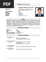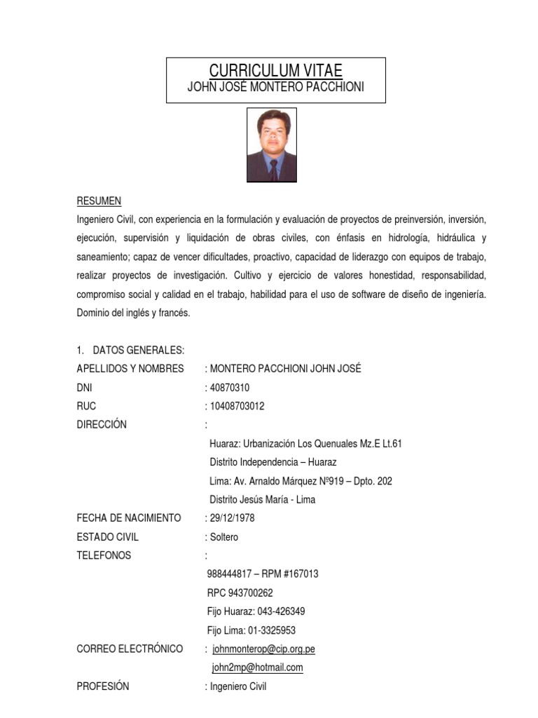 RESUMEN Ingeniero Civil, con experiencia en la formulacin y evaluacin de proyectos de preinversin, inversin, ejecucin, supervisin y liquidacin de obras civiles, con nfasis en hidrologa, hidrulica y saneamiento; capaz de vencer dificultades, proactivo, capacidad de liderazgo con equipos de trabajo, realizar proyectos de investigacin. Cultivo y ejercicio de valores honestidad, responsabilidad, compromiso social y calidad en el trabajo, habilidad para el uso de software de diseo de ingeniera. Dominio del ingls y francs. 1. DATOS GENERALES: APELLIDOS Y NOMBRES DNI RUC DIRECCIN : MONTERO PACCHIONI JOHN JOS : 40870310 : 10408703012 : Huaraz: Urbanizacin Los Quenuales Mz.E Lt.61 Distrito Independencia Huaraz Lima: Av. Arnaldo Mrquez N919 Dpto. 202 Distrito Jess Mara - Lima FECHA DE NACIMIENTO ESTADO CIVIL TELEFONOS : 29/12/1978 : Soltero : 988444817 RPM #167013 RPC 943700262 Fijo Huaraz: 043-426349 Fijo Lima: 01-3325953 CORREO ELECTRNICO PROFESIN : johnmonterop@cip.org.pe john2mp@hotmail.com : Ingeniero Civil