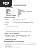 2. EXPERIENCIA LABORAL : Equipo tcnico del rea de mecnica de suelos para la elaboracin del Estudio Definitivo para el Asfaltado de la Carretera Casma Huaraz, Gobierno Regional de Ancash, Huaraz, 2002. Residente de obras de pavimentacin, Divisin de Obras, Gobierno Provincial de Huaraz, 2002 2003. Asistente tcnico de la obra Construccin del Reservorio de Batan 1,800m3, EPS Chavn S.A, Huaraz, 2003.