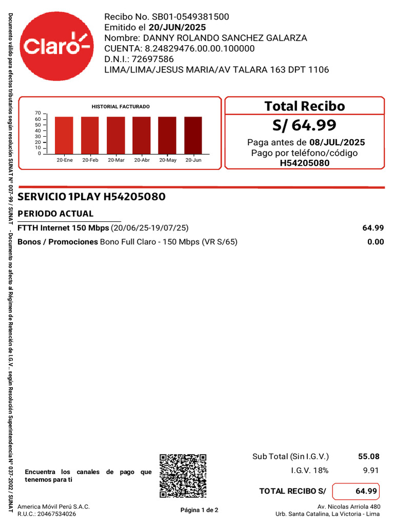 Bonos / Promociones Bono Full Claro - 150 Mbps (VR S/65) 0.00