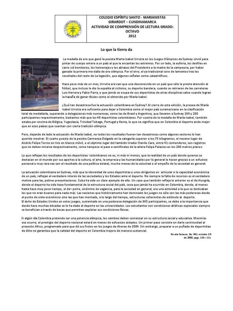 Competencia interpretativa 1.Completa, en tu cuaderno, los siguientes enunciados con ideas coherentes tomadas de la lectura: a. La medalla de oro que gan Mara Isabel Urrutia en los Juegos Olmpicos de Sidney.____________ b. Los abrazos del presidente._____________ c. El ftbol._______________ d. Colombia en la clasificacin total de medalleras.____________ e. No todos los resultados fueron tan desastrosos.__________________ f. Lo que reflejan los resultados de los deportistas colombianos.__________________ 2.En tu cuaderno, disea un cuadro en el que clasifiques la informacin de los prrafos 3 y 4. Piensa en los criterios de clasificacin (temas y asuntos) y en el orden en que ubicars las ideas. 3.Explica el sentido que tiene el ttulo con relacin al contenido de la lectura. 4.Si el texto se dividiera en dos captulos, cmo agruparas la informacin: Qu ttulo llevara cada captulo? 5.Escribe, en tu cuaderno, la idea principal de los prrafos 5 y 6 6.Qu funcin cumple el prrafo 7 en el contexto general de la lectura? 7.Cul es el propsito final del autor? Qu efecto busca en el lector? Competencia argumentativa La lectura plantea un tema polmico, con muchos factores que analizar. De una parte, estn las hiptesis que plantea el texto y, de otra, las que se generan en el lector. Para definir estas ideas, desarrolla estas actividades: 8. Por qu se afirma que a Colombia "le encantan los extremos''1 Agrega un argumento tuyo, a favor o en contra de esta idea. 9.Cmo se demuestra que no siempre la falta de recursos es el verdadero motivo para justificad las pobres presentaciones de Colombia en los pasados Juegos Olmpicos? Competencia propositiva 10. Expresa una opinin crtica, fundamentada, por lo menos, con tres argumentos contundentes, respecto a uno de los siguientes planteamientos: a. El deporte es sinnimo de vagancia. b. En Colombia, el deporte es un medio para salir de la pobreza. c. El deporte, en Colombia, representa lo que somos, lo que sentimos y lo que pensamos los colombianos.