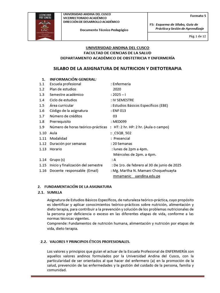 SILABO DE LA ASIGNATURA DE NUTRICION Y DIETOTERAPIA