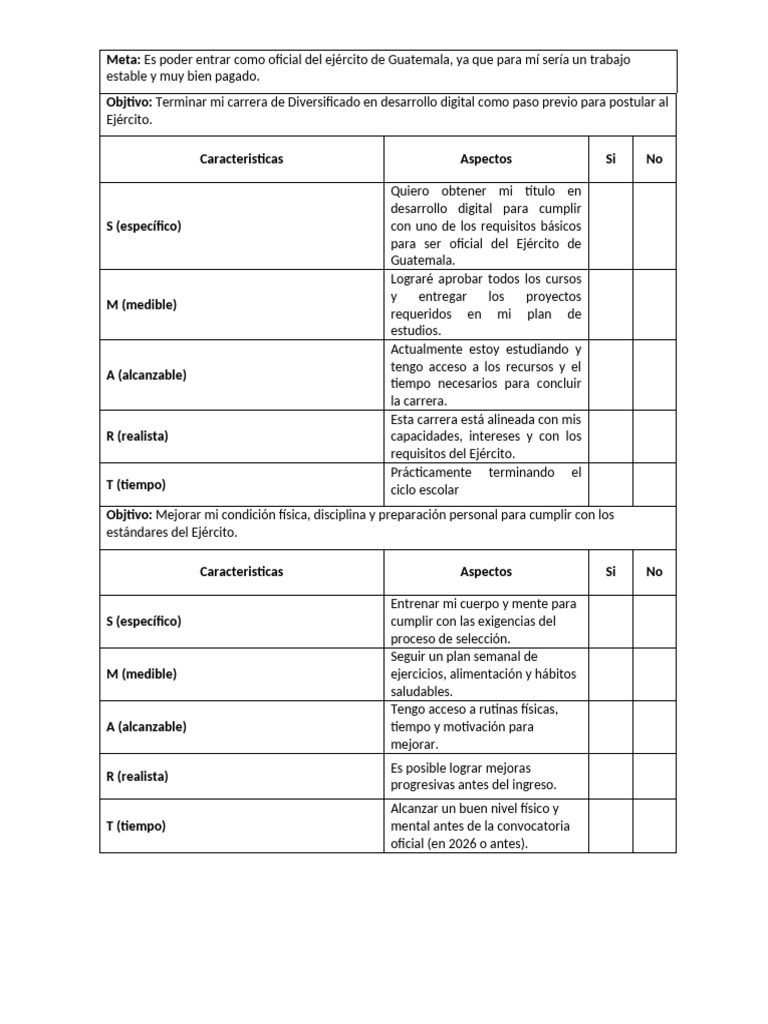 Meta: Es poder entrar como oficial del ejército de Guatemala, ya que para mí sería un trabajo