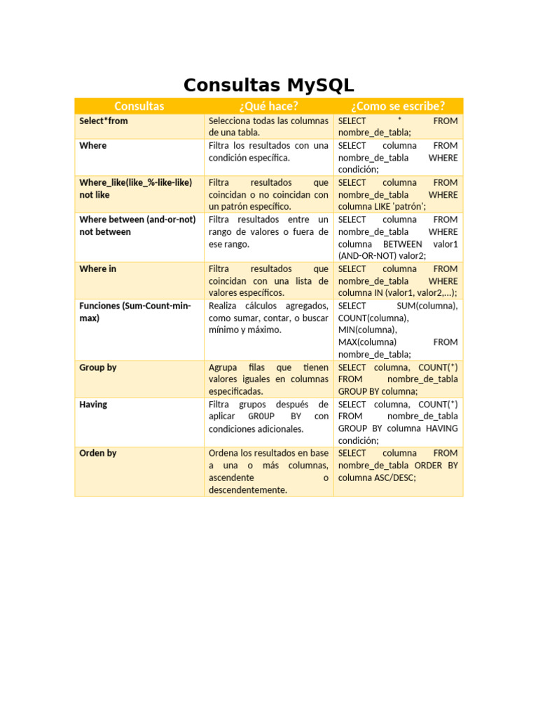 Funciones (Sum-Count-min- Realiza cálculos agregados, SELECT SUM(columna),