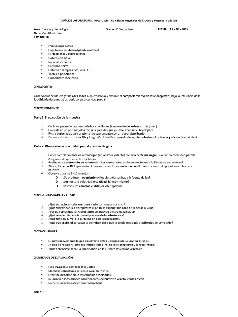 GUÍA DE LABORATORIO: Observación de células vegetales de Elodea y respuesta a la luz