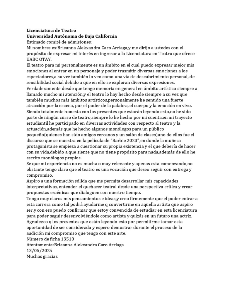 propósito de expresar mi interés en ingresar a la Licenciatura en Teatro que ofrece