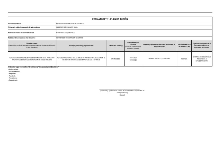 FORMATO N° 17 - PLAN DE ACCIÓN