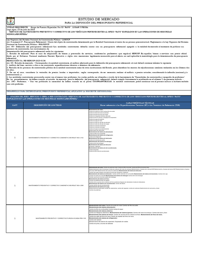 1.- ANÁLISIS DEL BIEN, SERVICIO U OBRA A SER CONTRATADO:“SERVICIO DE MANTENIMIENTO PREVENTIVO Y CORRECTIVO DE LOS VEHÍCULOS PERTENECIENTES AL GFE53 “RAYO”