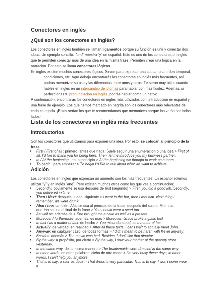 condiciones, etc. Aquí debajo encontrarás los conectores en inglés más frecuentes, así