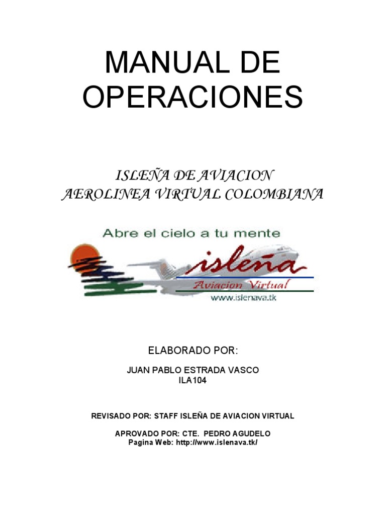 1.1. mbito de Aplicacin: Este manual comprende todas las operaciones de vuelo regular y no regular de islea de aviacin virtual y est dirigido a todos los pilotos integrantes de la aerolnea, mientras cumplen funciones en aeronaves de la Flota. 1.2. Objetivo: Garantizar la seguridad de la operacin area, evitando bajo todo Punto de vista cualquier maniobra, procedimiento, o movimiento que ponga en Riesgo la integridad del pasajero, de terceros, o del material propiedad de la Empresa. 1.3. Autoridades de Aplicacin: Se designan como autoridad de aplicacin del presente manual a los miembros del Comit Ejecutivo, quienes evaluarn los casos particulares, y aplicarn las sanciones que correspondieran si este manual no es Acatado.