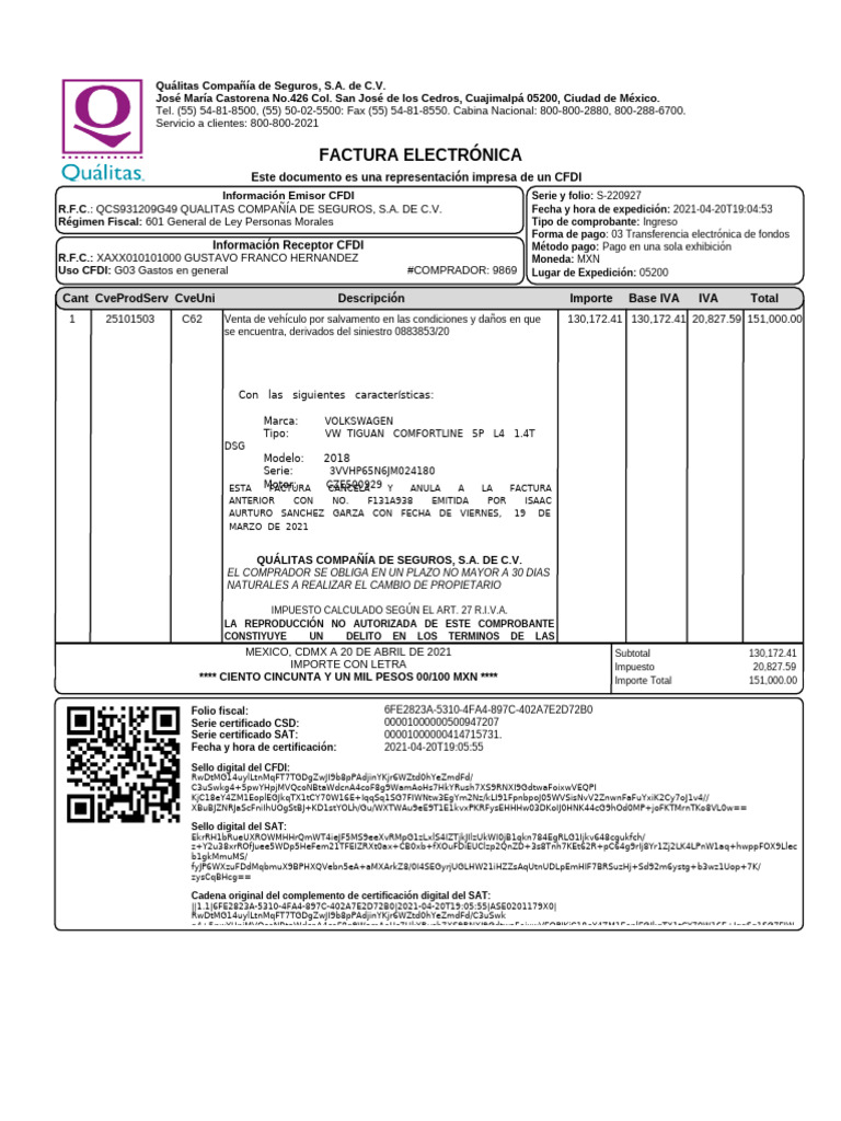 R.F.C.: QCS931209G49 QUALITAS COMPAÑÍA DE SEGUROS, S.A. DE C.V. Fecha y hora de expedición: 2021-04-20T[Link]