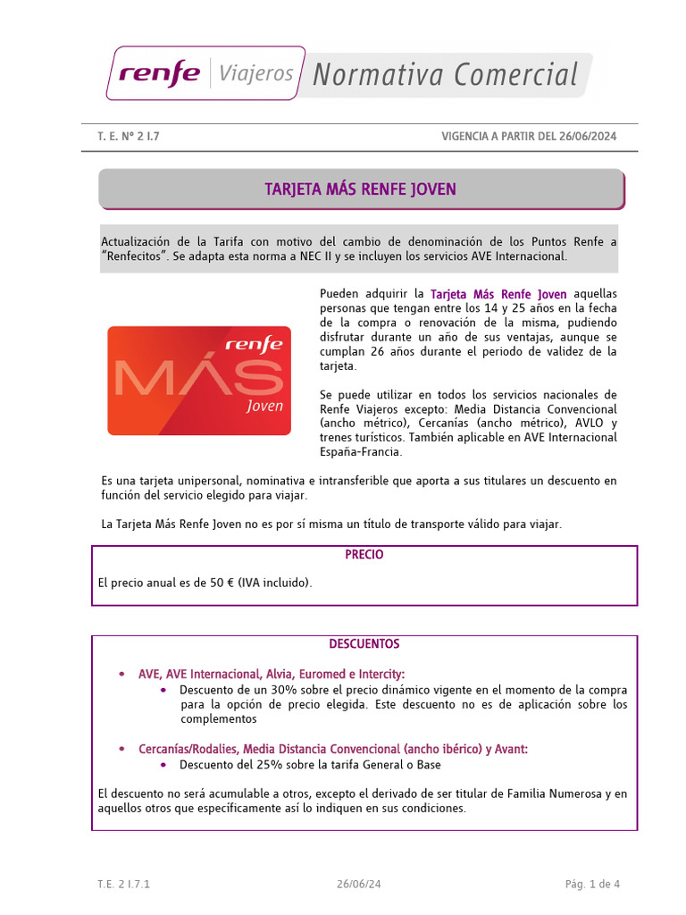 Esta Tarifa anula y sustituye a la Tarifa Especial nº 2 I.7 “Tarjeta Más Renfe Joven” de fecha 25 de