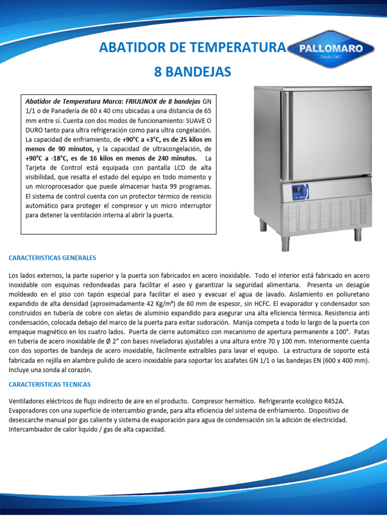 Abatidor de Temperatura Marca: FRIULINOX de 8 bandejas GN