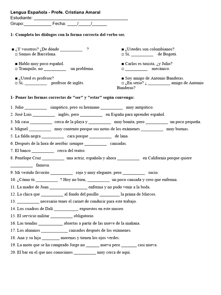 1- Poner las formas correctas de "ser" y "estar" según convenga: