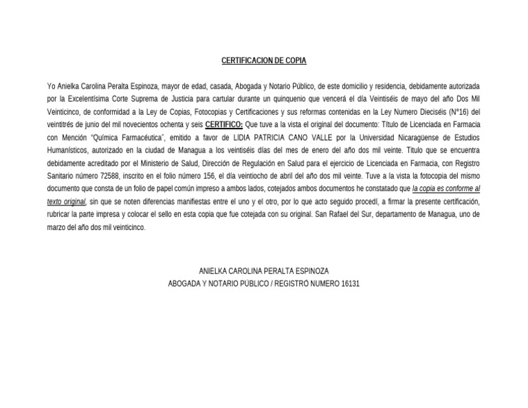 Yo Anielka Carolina Peralta Espinoza, mayor de edad, casada, Abogada y Notario Público, de este domicilio y residencia, debidamente autorizada