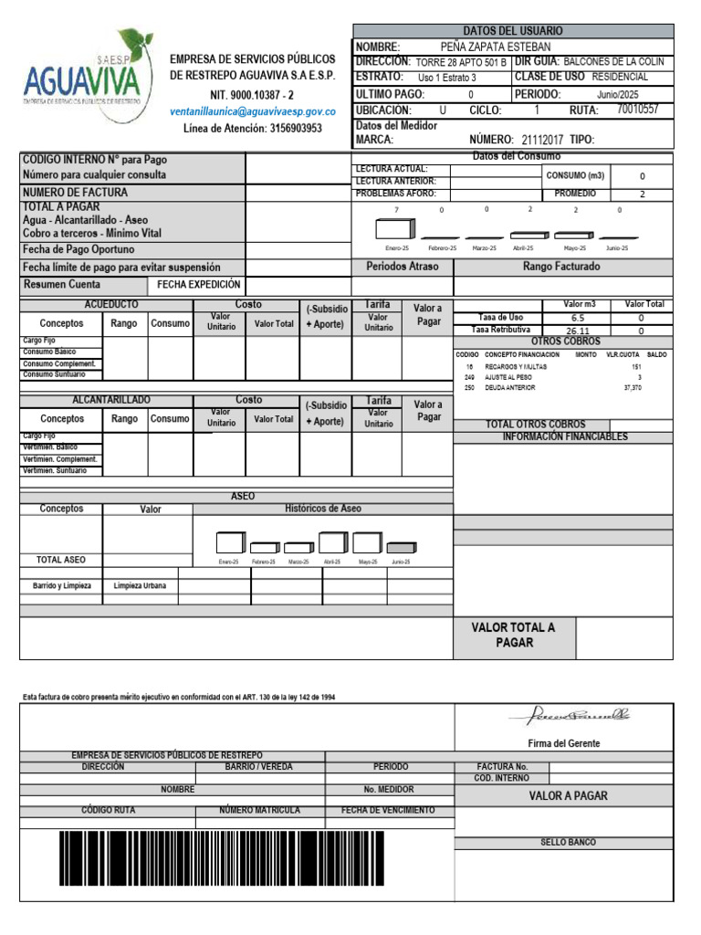 Esta factura de cobro presenta mérito ejecutivo en conformidad con el ART. 130 de la ley 142 de 1994