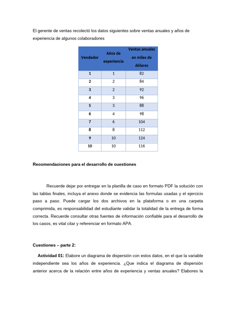 la variable independiente (años de experiencia) y variable dependiente (ventas anuales)