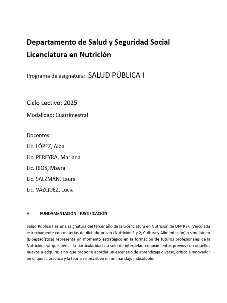 Salud Pública I es una asignatura del tercer año de la Licenciatura en Nutrición de UNTREF. Vinculada